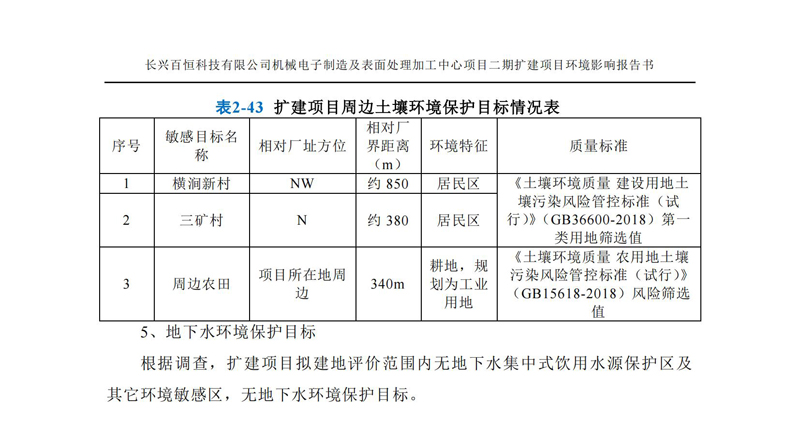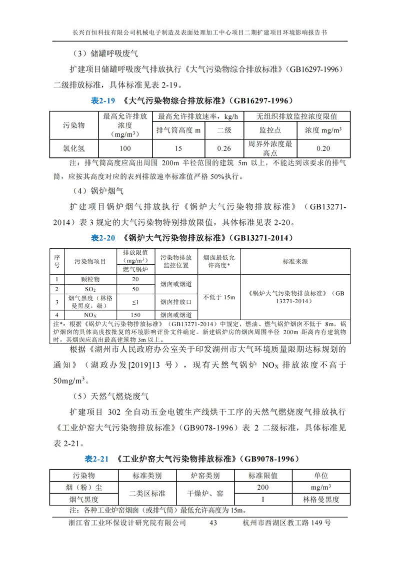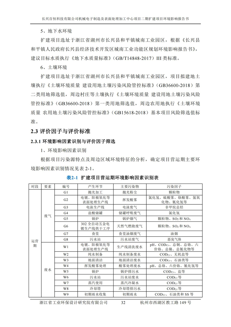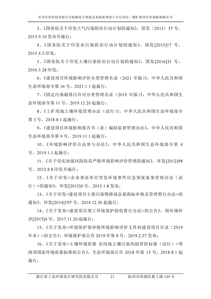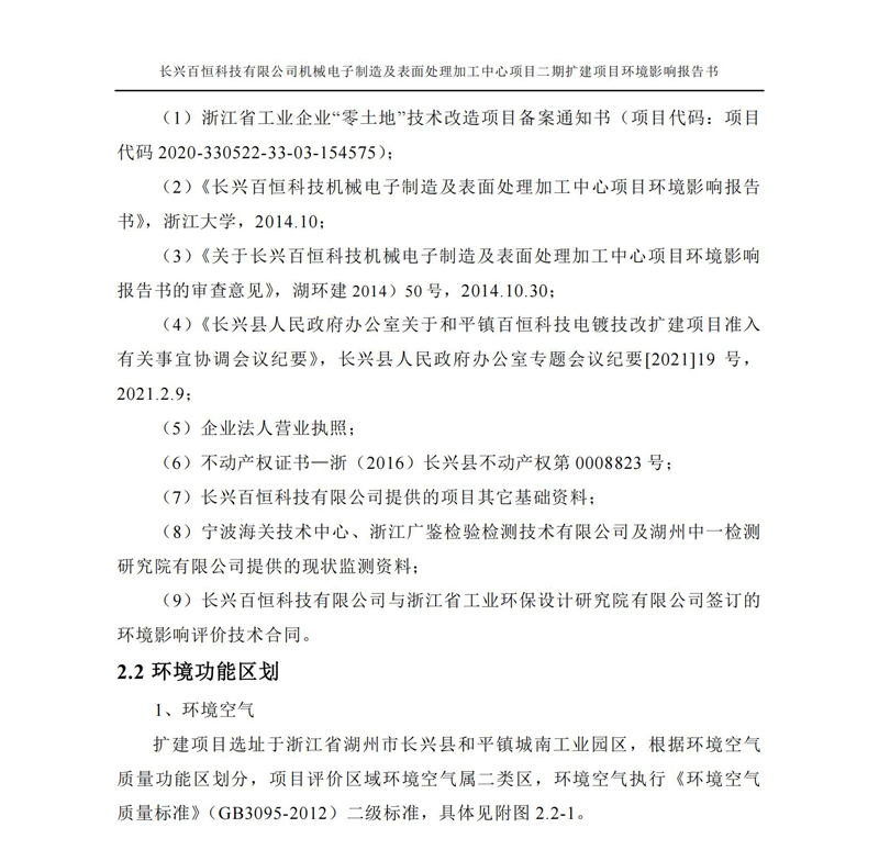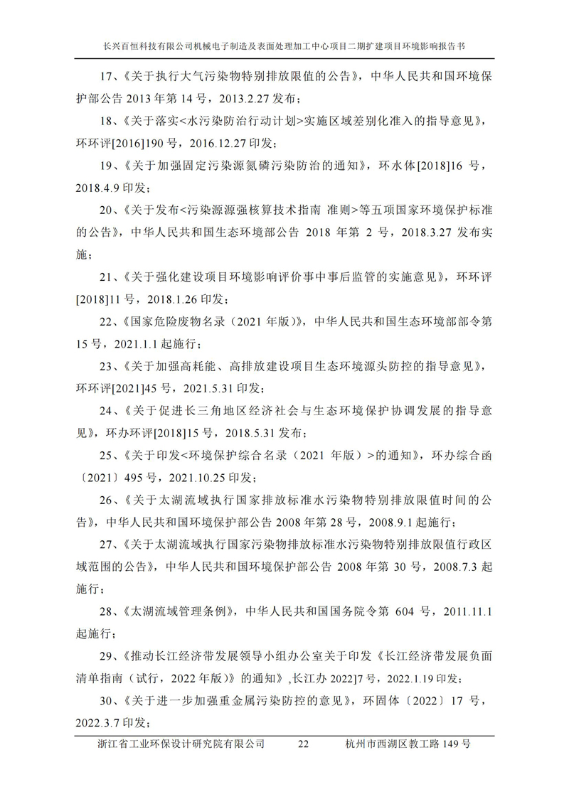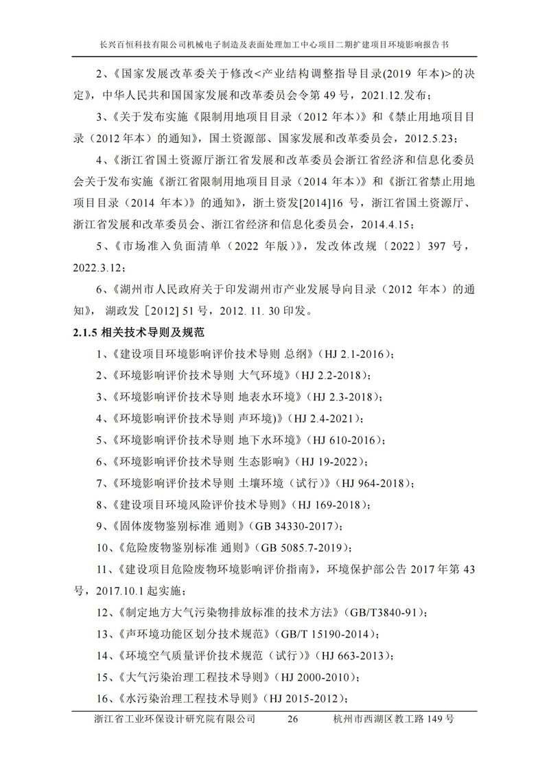 根據(jù)要求我公司對長興百恒科技有限公司二期擴(kuò)建項(xiàng)目環(huán)評報(bào)告書進(jìn)行全本公示發(fā)布日期:2022/9/26 類別:公司新聞 瀏覽量: 3175 根據(jù)《浙江省建設(shè)項(xiàng)目環(huán)境保護(hù)管理辦法(2018年修正)》及相關(guān)要求,我公司對長興百恒科技有限公司機(jī)械電子制造及表面處理加工中心項(xiàng)目二期擴(kuò)建項(xiàng)目環(huán)境影響報(bào)告書進(jìn)行全本公示
